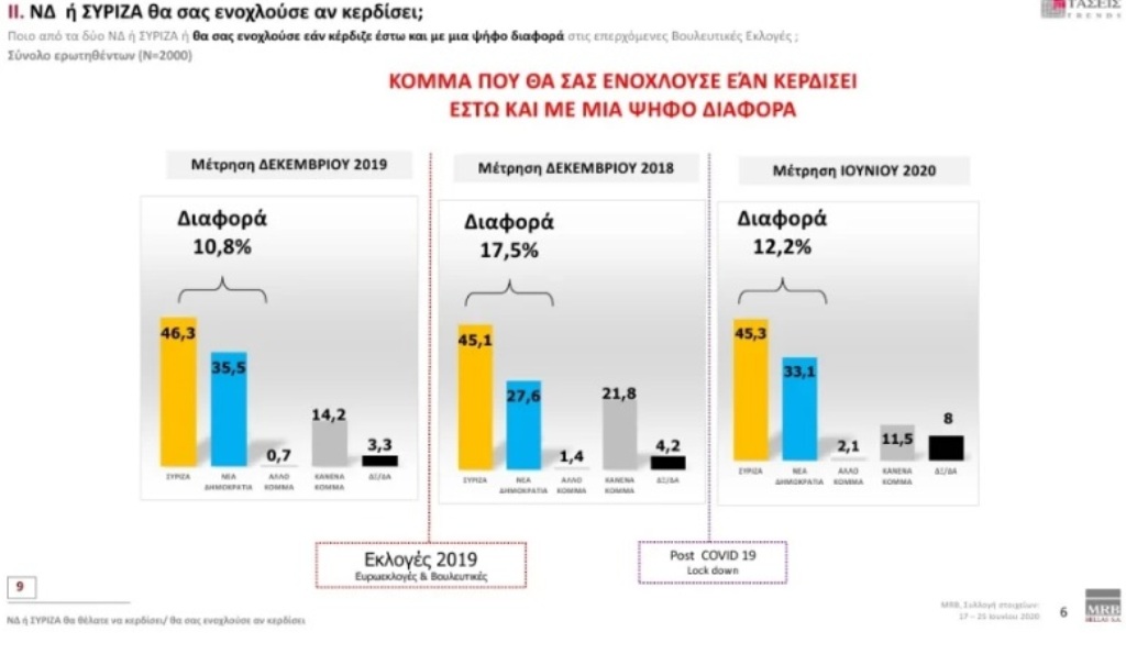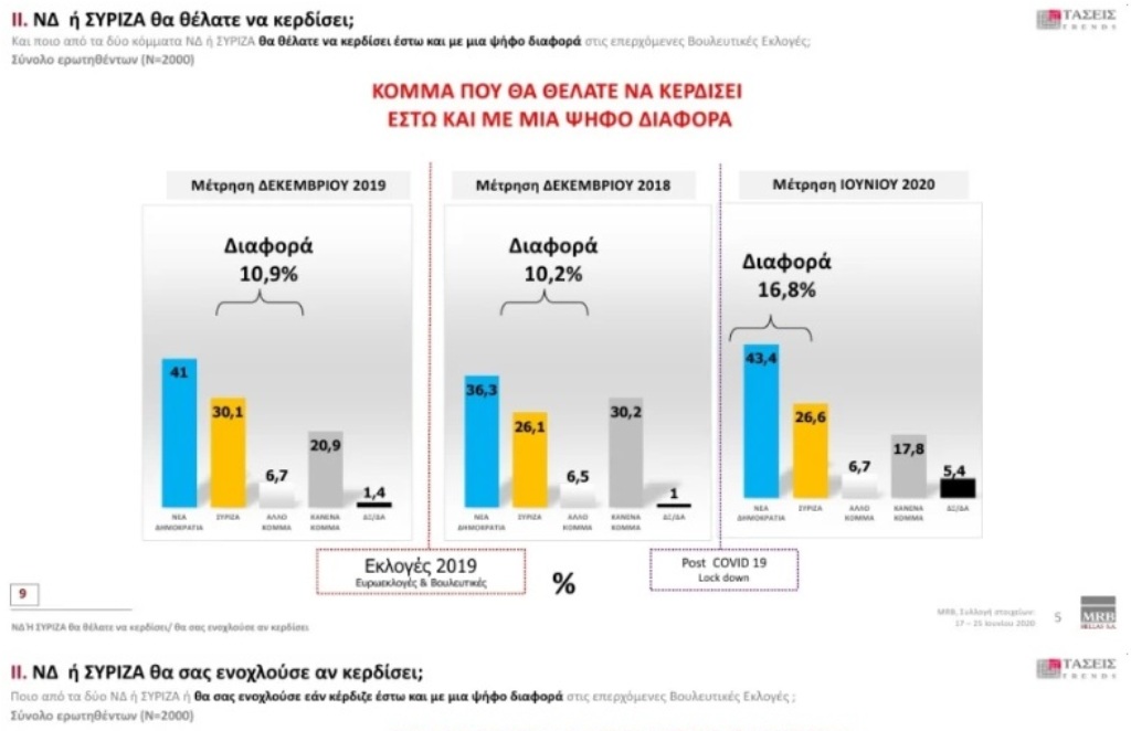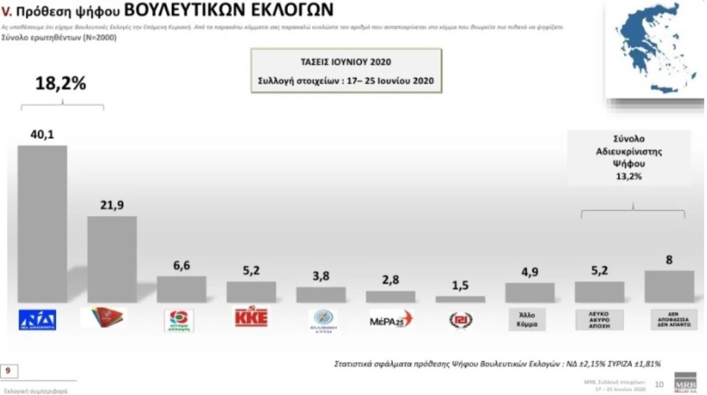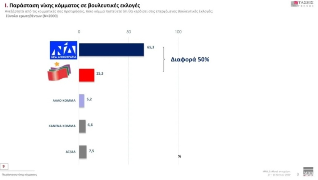 Πρόθεση ψήφου: Η ΝΔ προηγείται με διαφορά 18,2% έναντι του ΣΥΡΙΖΑ, ενώ στην παράσταση νίκης η ΝΔ συγκεντρώνει 65,3% έναντι 15,3% του ΣΥΡΙΖΑ.