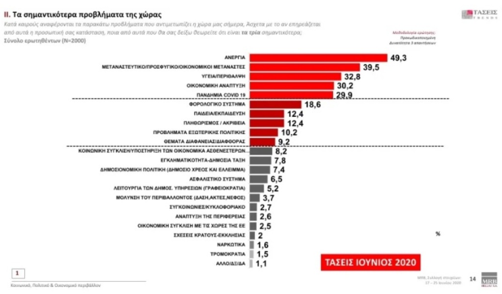 Το μεταναστευτικό είναι ο δεύτερος μεγαλύτερος προβληματισμός τους και ο χώρος της υγείας/περίθαλψης ακολουθεί στην τρίτη θέση, όπως αποκαλύπτεται από πανελλαδική έρευνα της MRB που έλαβε χώρα το διάστημα 17-25 Ιουνίου του 2020, σε δείγμα 2.000 πολιτών με δικαίωμα ψήφου. Τόσο η οικονομική κατάσταση όσο και η πανδημία του κορωνοϊού δεν βρίσκονται στην κορυφαία τριάδα των σημαντικότερων προβλημάτων, που τους απασχολούν.