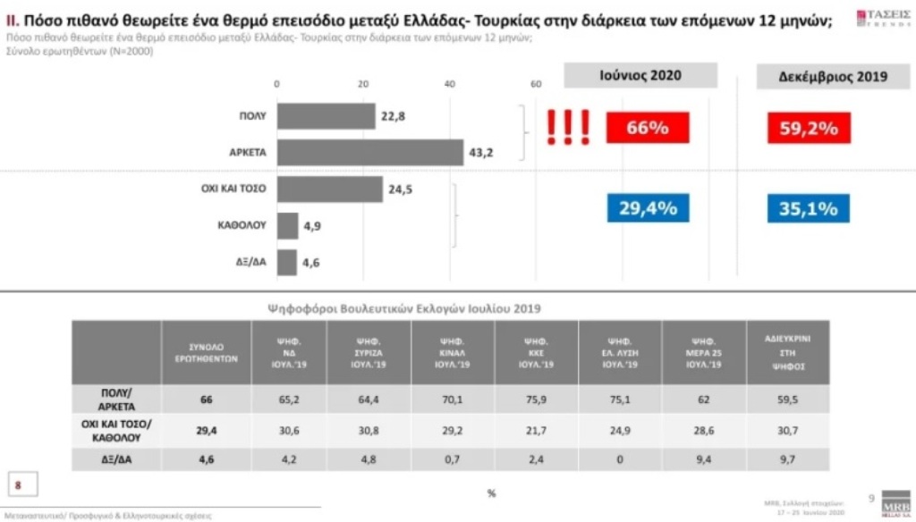Αναφορικά με τα ελληνοτουρκικά και την πιθανότητα ενός «θερμού» επεισοδίου, οι ερωτώμενοι απάντησαν ότι το θεωρούν Πολύ/Αρκετά πιθανό σε ποσοστό 66%.