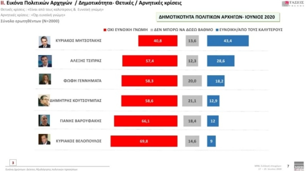 Στις αρνητικές κρίσεις, 40,8% έχουμε για τον Κυριάκο Μητσοτάκη και 57,4% για τον Αλέξη Τσίπρα, με τον Κυριάκο Βελόπουλο να συγκεντρώνει το 69,8%.