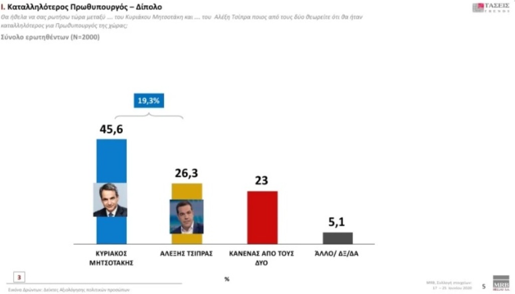 Στο ερώτημα για τον καταλληλότερο πρωθυπουργό, οι ερωτώμενοι απάντησαν κατά 45,6% υπέρ του Κυριάκου Μητσοτάκη και κατά 26,3% υπέρ του Αλέξη Τσίπρα, ενώ το 23% απάντησε: «Κανένας από τους δύο».