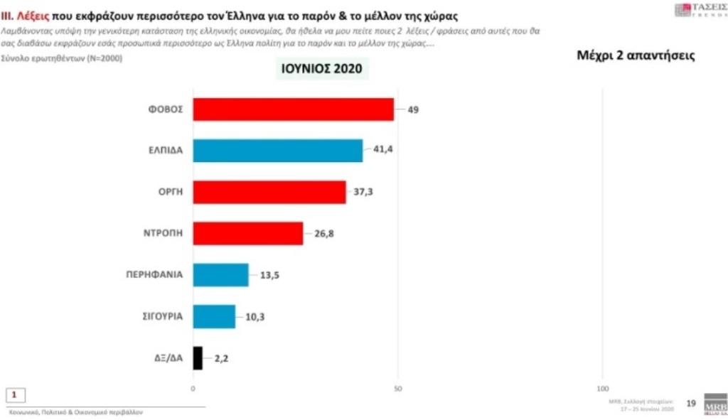 Λέξεις: Ο «φόβος» με 49% εκφράζει περισσότερο τους πολίτες για το παρόν και το μέλλον της χώρας, ενώ «ελπίδα» συγκεντρώνει ποσοστό 41,4% και η «οργή» 37,3%.