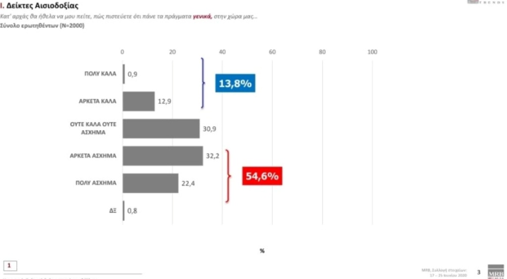 Στην ερώτηση αναφορικά με το πώς πιστεύετε ότι πάνε τα πράγματα γενικά στη χώρα μας, το 54,6% απάντησε «Πολύ άσχημα-Αρκετά άσχημα», ενώ το 13,8% απάντησε «Πολύ καλά-Αρκετά καλά».