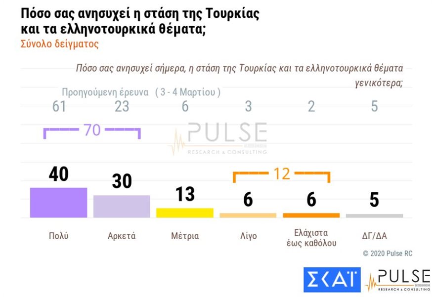 Προβληματισμός υπάρχει και για τα ελληνοτουρκικά με το 70% των ερωτηθέντων να απαντά ότι ανησυχούν αρκετά ή πολύ για τη στάση της Τουρκίας και τα ελληνοτουρκικά έναντι 12% που δήλωσαν λίγη ή ελάχιστη έως καθόλου ανησυχία.
