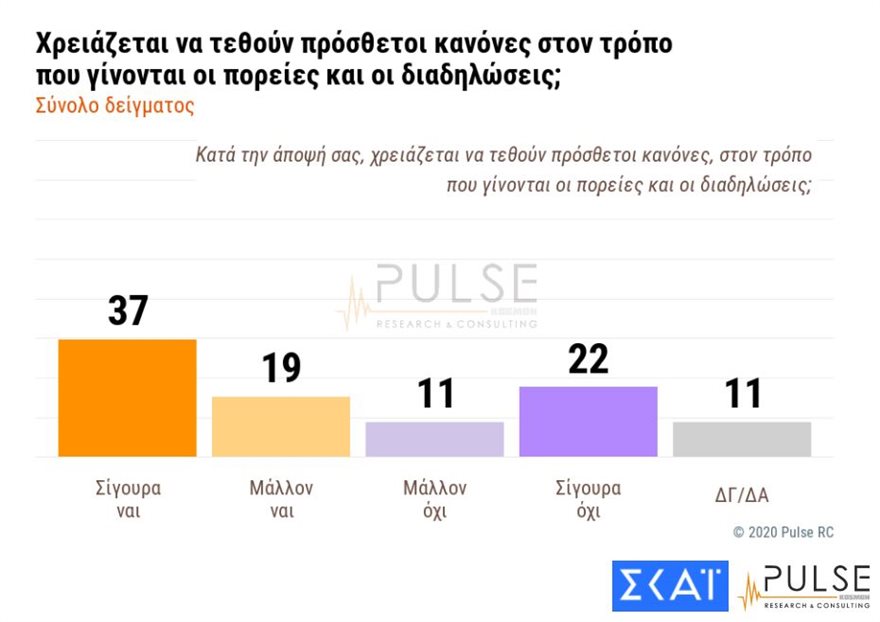 Τέλος, το 56% θεωρεί ότι (σίγουρα ή μάλλον) χρειάζεται να τεθούν πρόσθετοι κανόνες στον τρόπο που γίνονται οι πορείες και διαδηλώσεις, ενώ το 33% διαφωνεί.