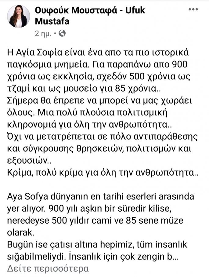 Αγία Σοφία αποτελεί μια πολύ πλούσια πολιτισμική κληρονομιά για όλη την ανθρωπότητα και θα έπρεπε να μας χωράει όλους, αντί να μετατρέπεται σε πόλο αντιπαράθεσης και σύγκρουσης θρησκειών, πολιτισμών και εξουσιών. Αυτό επισημαίνει σε ανάρτησή της στα κοινωνικά δίκτυα η δικηγόρος από την Κομοτηνή, Ουφούκ Μουσταφά, δραστήριο μέλος της μουσουλμανικής μειονότητας στη Θράκη.