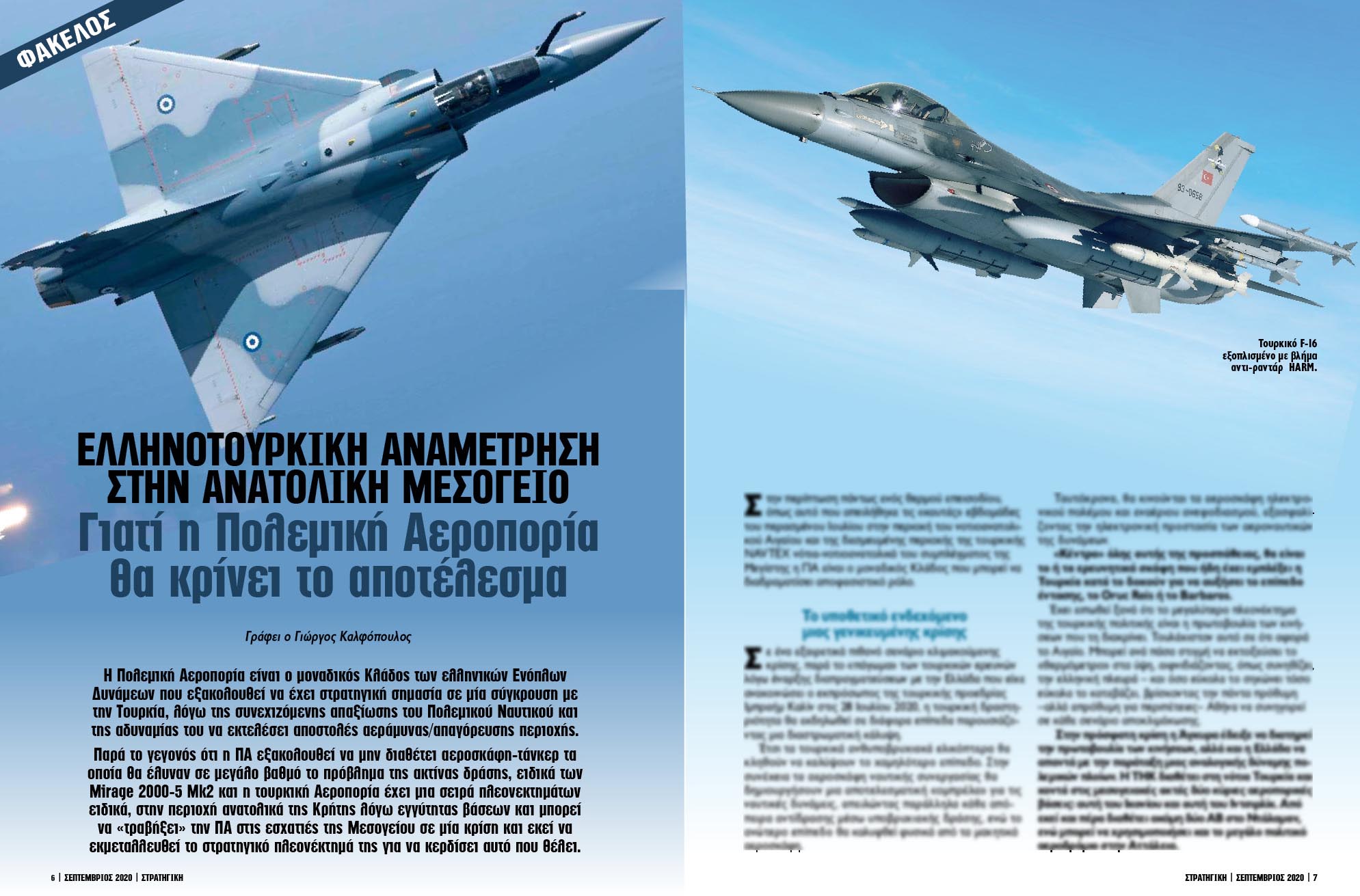 Στη νέα έκδοση ξεχωρίζει η μεγάλη μελέτη-ανάλυση για τον ρόλο της Πολεμικής Αεροπορίας σε μία ενδεχόμενη «θερμή» σύγκρουση με τη Τουρκία στο νοτιοανατολικό Αιγαίο και την Ανατολική Μεσόγειο και πώς αυτή θα κρίνει το αποτέλεσμα, καθώς το Πολεμικό Ναυτικό αδυνατεί λόγω ανυπαρξίας αντιαεροπορικών όπλων αεράμυνας περιοχής να αντιμετωπίσει την τουρκική Αεροπορία.