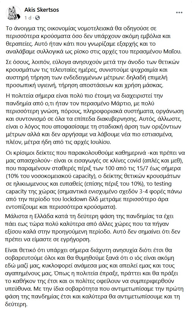 Ο υφυπουργός Άκης Σκέρτσος μέσω ανάρτησης στα social media τόνισε ότι η κυβέρνηση γνώριζε από την πρώτη στιγμή που άρθηκε το lockdown ότι θα επέλθει μεγάλη αύξηση στον αριθμό των κρουσμάτων, καθώς δεν υπάρχει θεραπεία ή εμβόλιο.