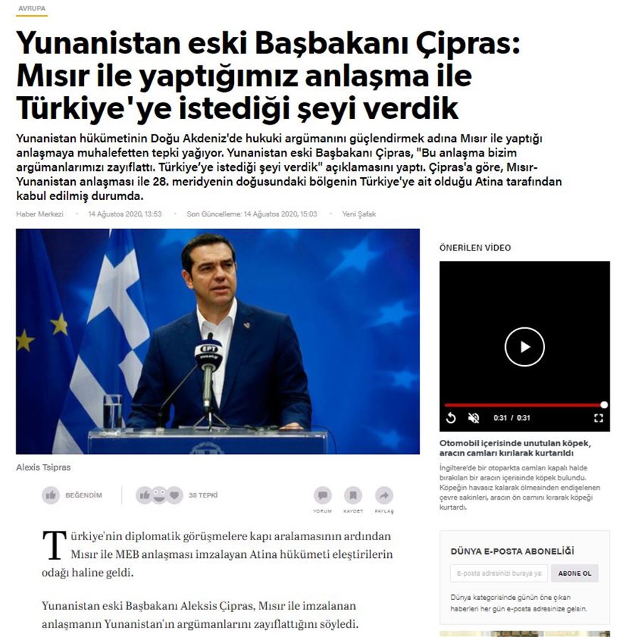 «Πρώην πρωθυπουργός της Ελλάδας Τσίπρας: Με τη συμφωνία με την Αίγυπτο δώσαμε στην Τουρκία αυτό που ήθελε», γράφει χαρακτηριστικά η τουρκική εφημερίδα «Yeni Safak», φιλοξενώντας το επίμαχο απόσπασμα από το άρθρο του Αλέξη Τσίπρα στην «ΕφΣυν».