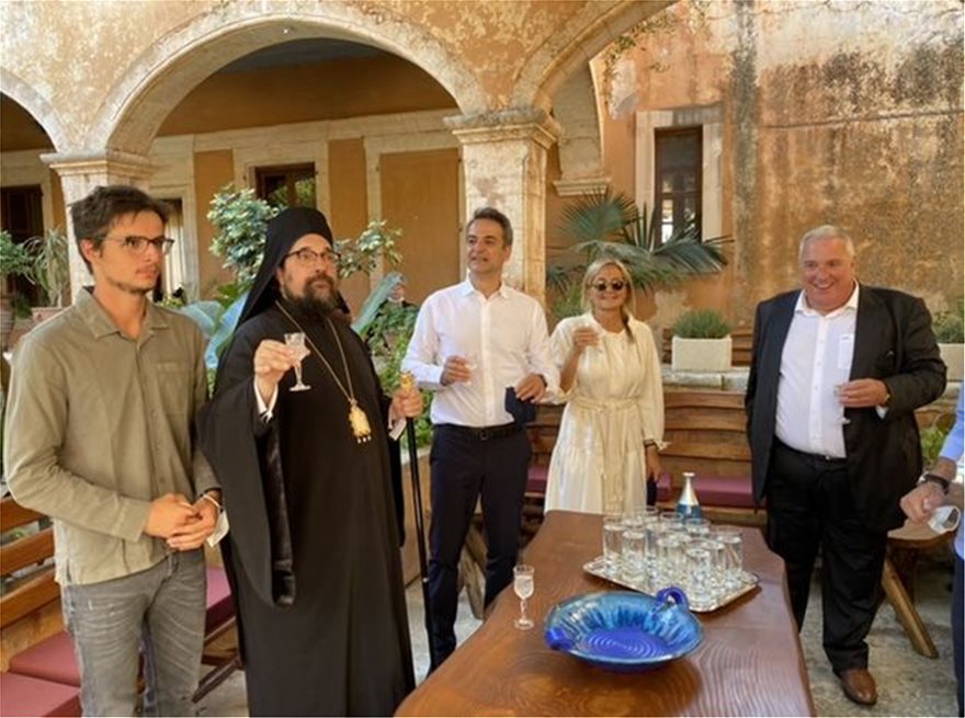 Αφού τελείωσε η λειτουργία στην Ιερά Μονή της Αγίας Τριάδας Τζαγκαρόλων στο Ακρωτήρι, ο Κυριάκος Μητσοτάκης συνοδευόμενος από τη σύζυγό του Μαρέβα Γκραμπόφσκι – Μητσοτάκη και τον γιο του, Κωνσταντίνο ξεναγήθηκαν στην εκκλησία.