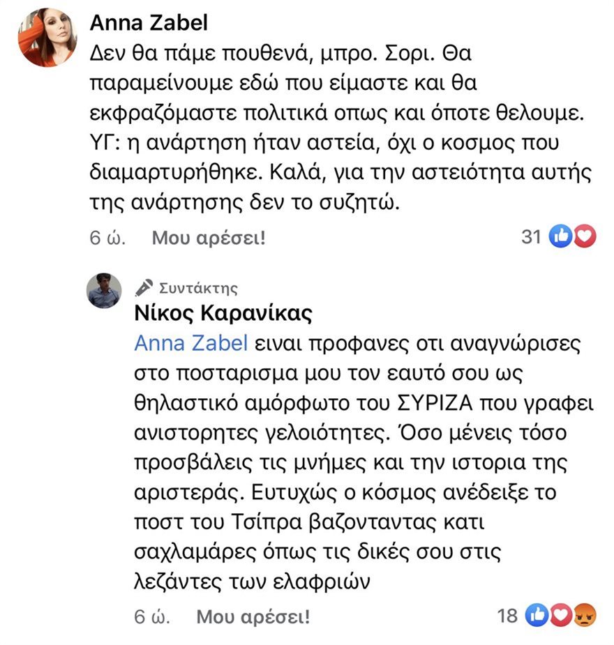 Ανάμεσα σε αυτούς και η Anna Zabel, μέλος του ΣΥΡΙΖΑ, η οποία σχολίασε πως «η ανάρτηση ήταν αστεία, όχι ο κόσμος που διαμαρτυρήθηκε. Καλά για την αστειότητα αυτής της ανάρτησης δεν το συζητώ» και απευθυνόμενη προς τον κ. Καρανίκα κατέληξε: «Εσύ γιατί είσαι στην Αριστερά; Για να κάνεις τον πολιτικό βαστάζο και τον πορτιέρη της παράταξης ρίχνοντας λεκτικά περιττώματα όπως αυτά στους συντρόφους σου;»