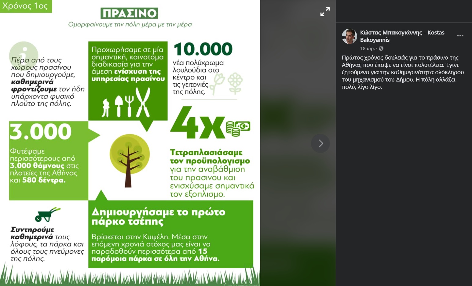 “Πρώτος χρόνος δουλειάς για το πράσινο της Αθήνας που έπαψε να είναι πολυτέλεια. Έγινε ζητούμενο για την καθημερινότητα ολόκληρου του μηχανισμού του Δήμου. Η πόλη αλλάζει πολύ, λίγο λίγο” .