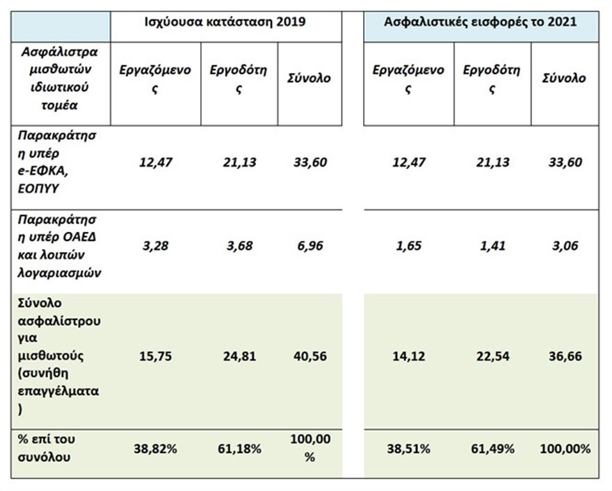 Με βάση την εξαγγελθείσα μείωση, το ύψος των ασφαλιστικών εισφορών στη μισθωτή εργασία στον ιδιωτικό τομέα για το έτος 2021 διαμορφώνεται σύμφωνα με τον ακόλουθο πίνακα: