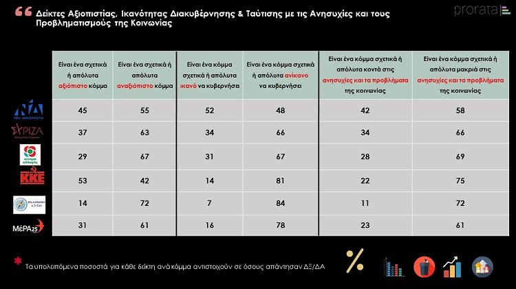 Σύμφωνα με την δημοσκόπηση της Prorata, το 53% των συμμετεχόντων εκτιμάει ότι το ΚΚΕ είναι το πιο αξιόπιστο πολιτικό κόμμα, ενώ ακολουθούν η Νέα Δημοκρατία (45%) και ο ΣΥΡΙΖΑ (37%). Το κόμμα που προσλαμβάνεται ως το λιγότερο αξιόπιστο είναι η Ελληνική Λύση (14%).