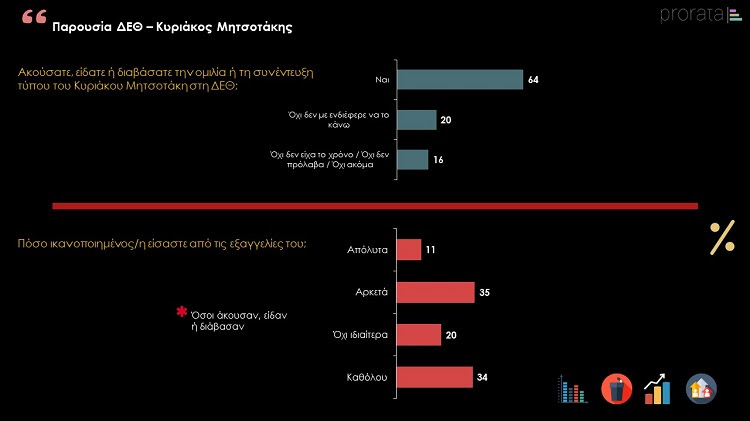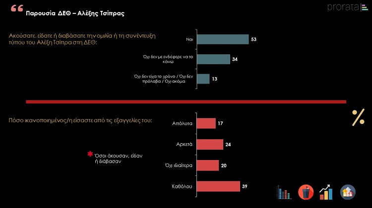 Περίπου 6 στους 10 είδαν, άκουσαν ή διάβασαν την ομιλία ή τη συνέντευξη τύπου του πρωθυπουργού, Κυριάκου Μητσοτάκη, στη ΔΕΘ. Μεταξύ αυτών, το 46% δήλωσε απόλυτα ή αρκετά ικανοποιημένο, ενώ το 54% καθόλου ή όχι ιδιαίτερα ικανοποιημένο. Αντίστοιχα, περίπου 5 στους 10 έπραξαν αντίστοιχα σε σχέση με την ομιλία ή τη συνέντευξη τύπου του αρχηγού της αξιωματικής αντιπολίτευσης, Αλέξη Τσίπρα, εκ των οποίων το 41% έμεινε αρκετά ή απόλυτα ικανοποιημένο και το 59% καθόλου ή όχι ιδιαίτερα ικανοποιημένο.