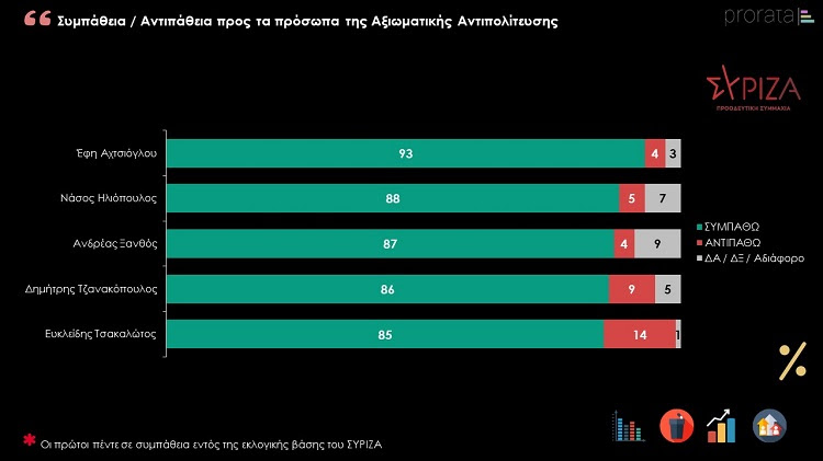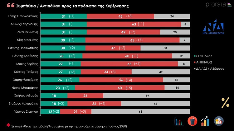 Τα πρόσωπα που παρουσιάζουν τη μεγαλύτερη αύξηση της δημοφιλίας τους είναι ο Γιώργος Κατρούγκαλος και ο Ευκλείδης Τσακαλώτος, ενώ την μεγαλύτερη μείωση η Νίκη Κεραμέως, η Λίνα Μενδώνη και ο Βασίλης Κικίλιας.
