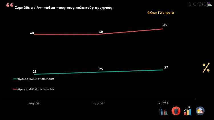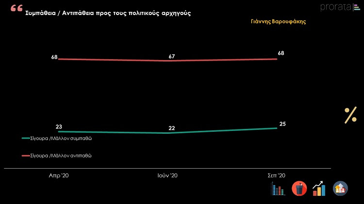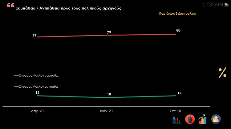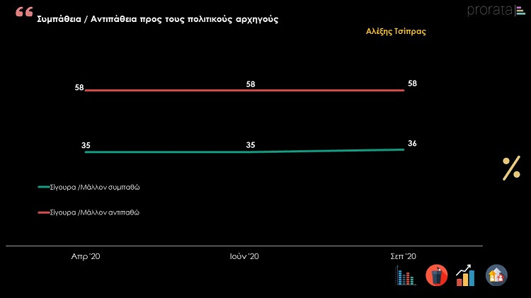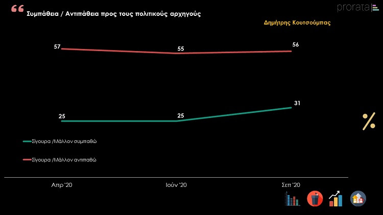 Ο Κυριάκος Μητσοτάκης παραμένει ο πιο δημοφιλής πολιτικός αρχηγός, καθώς το 48% των συμμετεχόντων σίγουρα ή μάλλον συμπαθεί τον πρωθυπουργό. Ωστόσο, οι αρνητικές εντυπώσεις προς το πρόσωπο του αυξήθηκαν σημαντικά σε σχέση με την μέτρηση του Ιουνίου από το 43% στο 47%.