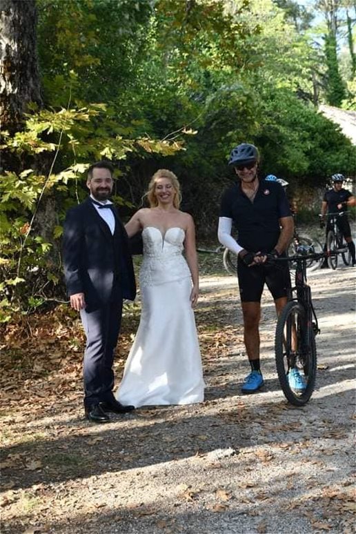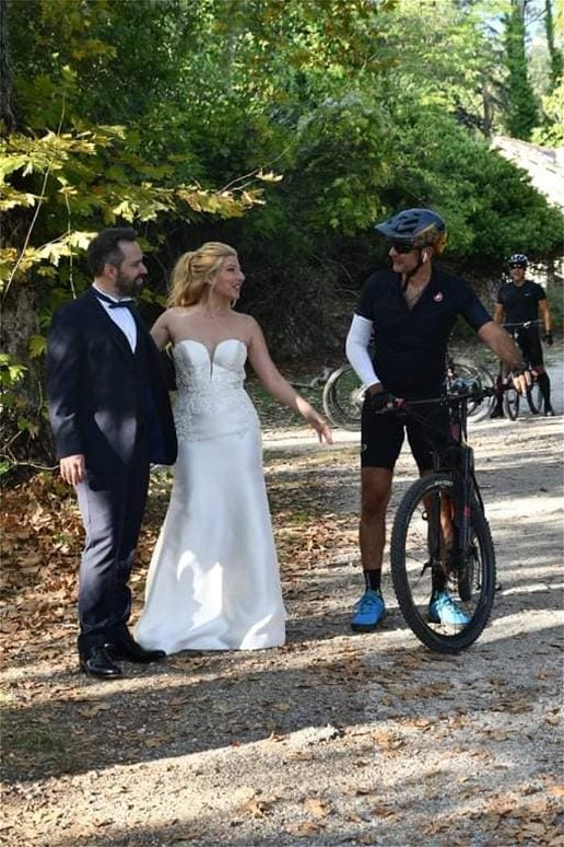 Ο πρωθυπουργός δεν χάλασε το χατίρι στη νύφη, κόρη γνωστού στελέχους της ΝΔ από τη Νίκαια και πόζαρε μαζί με τους νεόνυμφους πάνω στο ποδήλατο.