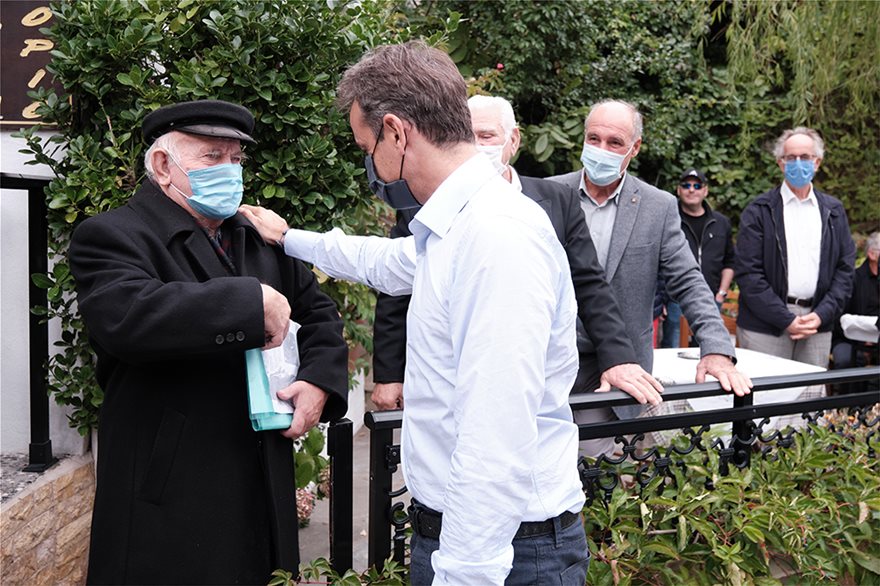 Ο κ. Μητσοτάκης χαιρέτισε, με τον τρόπο που καθιερώθηκε λόγω της πανδημίας, αρκετούς κατοίκους, συνομίλησε μαζί τους, όπως και με μικρά παιδιά. Δυο από αυτά τα ρώτησε γιατί δεν φορούσαν μάσκα.