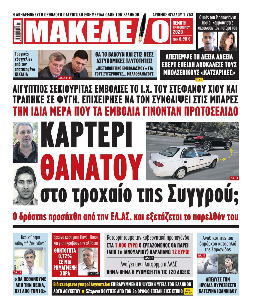 Ο εκδότης Στέφανος Χίος, όπως αποκαλύπτει σήμερα η εφημερίδα που εκδίδει είχε τροχαίο ατύχημα με το αυτοκίνητό του επί της μεσαίας λωρίδας της Λεωφόρου Συγγρού όταν ένα όχημα τον εμβόλισε, με αποτέλεσμα να συλληφθεί μετά από καταδίωξη ο Αιγύπτιος οδηγός του.