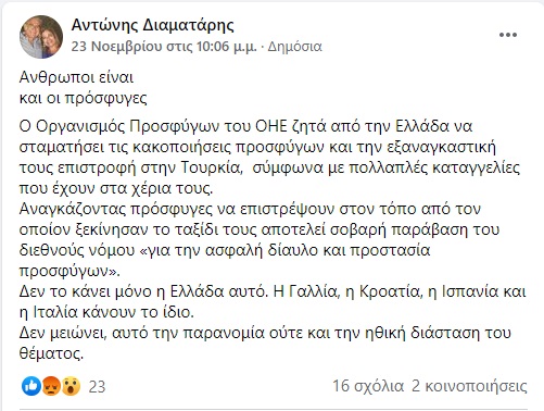 Συγκεκριμένα ο κ. Διαματάρης, αναφερόμενος σε “πρόσφυγες” είπε ότι η Ελλάδα “αναγκάζει πρόσφυγες να επιστρέψουν στον τόπο από τον οποίο ξεκίνησαν το ταξίδι τους, κάτι που “αποτελεί σοβαρή παράβαση του διεθνούς νόμου για την ασφαλή δίαυλο και προστασία προσφυγων”.