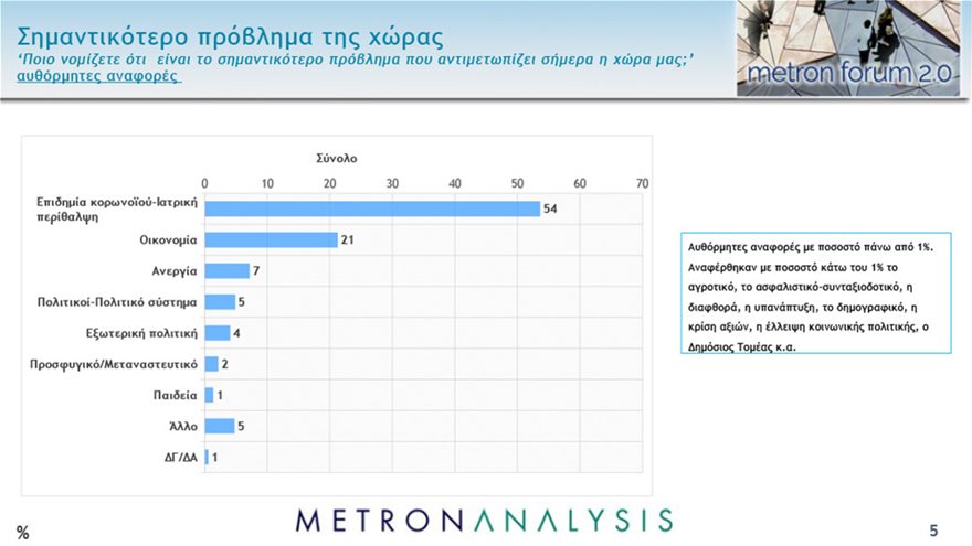 Το 49% των ερωτηθέντων θεωρεί ότι η πορεία της χώρας είναι προς τη σωστή κατεύθυνση, ενώ το 42% προς τη λάθος κατεύθυνση. Το σημαντικότερο πρόβλημα για τους πολίτες είναι με διαφορά η επιδημία του κορωνοϊού και η ιατρική περίθαλψη (54%) και ακολουθεί η οικονομία (21%) και η ανεργία (7%). Σημειώνεται ότι μόνο το 11% αξιολογεί θετικά τη σημερινή οικονομική κατάσταση.
