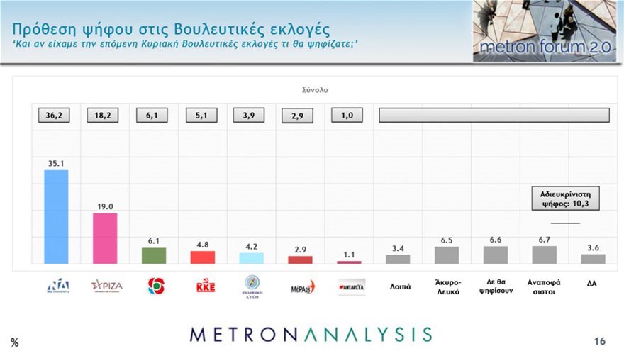 Στην μέτρηση της Metron Analysis για τον τηλεοπτικό σταθμό Mega, η ΝΔ προηγείται με 16,1 ποσοστιαίες μονάδες καθώς το 35,1% απαντά ότι θα ψήφιζε ΝΔ αν είχαμε εκλογές την επόμενη Κυριακή και το 19% ότι θα ψήφιζε ΣΥΡΙΖΑ.