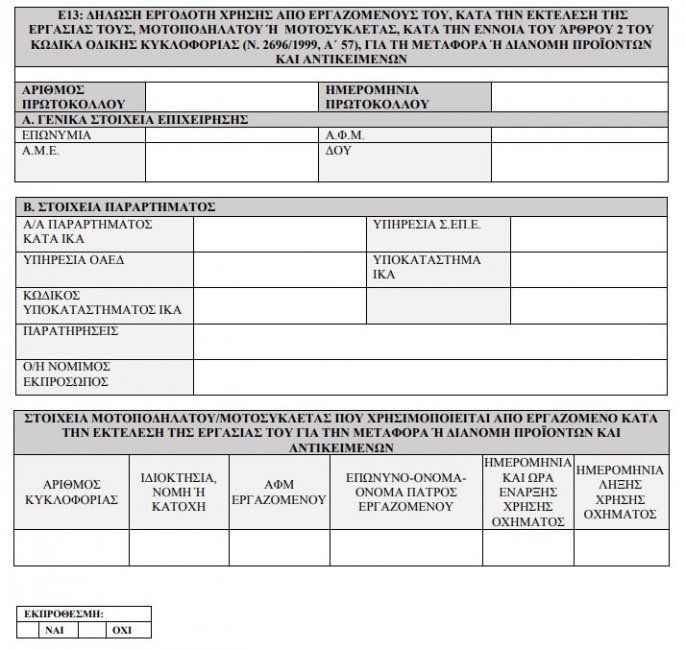 Με το νέο έντυπο Ε13, οι εργοδότες υποχρεούνται να προδηλώνουν την χρήση της μοτοσικλέτας από τον εργαζόμενο πριν την έναρξη της εργασίας για τη μεταφορά ή διανομή προϊόντων και αντικειμένων. Αντίστοιχα καταχωρείται η λήξη της χρήσης της μοτοσικλέτας, εφόσον αυτή δεν χρησιμοποιείται πια για τις ανάγκες των εργασιών της επιχείρησης.