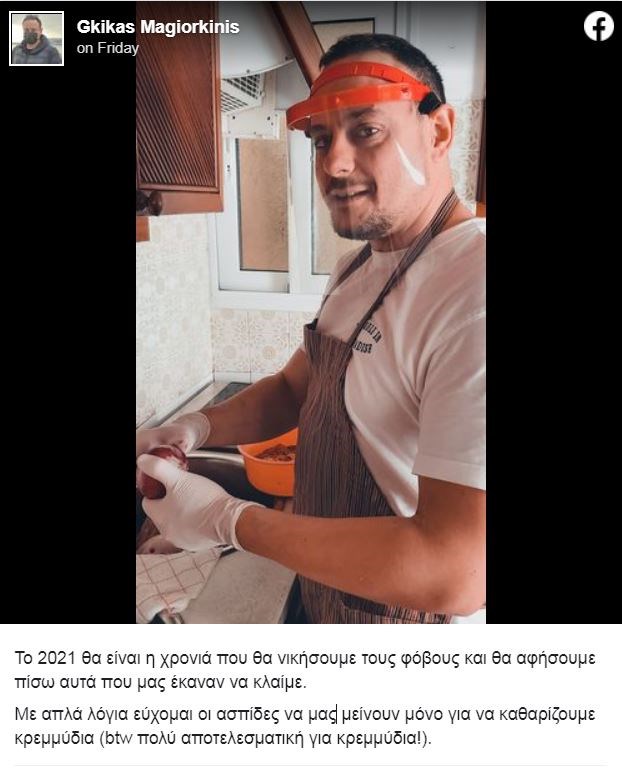 Ως λεζάντα στην εν λόγω φωτογραφία, σημειώνει πως «Το 2021 θα είναι η χρονιά που θα νικήσουμε τους φόβους και θα αφήσουμε πίσω αυτά που μας έκαναν να κλαίμε. Με απλά λόγια εύχομαι οι ασπίδες να μας μείνουν μόνο για να καθαρίζουμε κρεμμύδια (btw πολύ αποτελεσματική για κρεμμύδια!)».