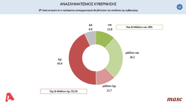 Όσο για τον ανασχηματισμό το 38% θεωρεί πως θα βελτιωθεί η απόδοση της κυβέρνησης, ενώ το αντίθετο πιστεύει το 55,1%.