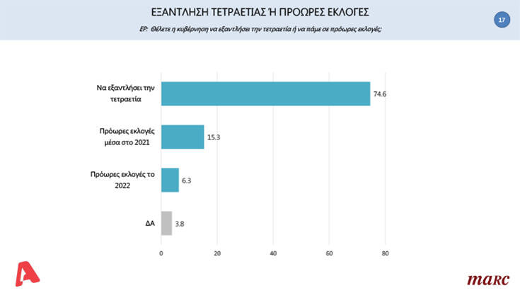 Στο ερώτημα για το αν η κυβέρνηση πρέπει να εξαντλήσει την 4ετία ή να υπάρξουν πρόωρες εκλογές, το 74,6% θέλει εξάντληση της 4ετίας, το 15,3% εκλογές μέσα στο 2021 και το 6,3% πρόωρες εκλογές το 2022.
