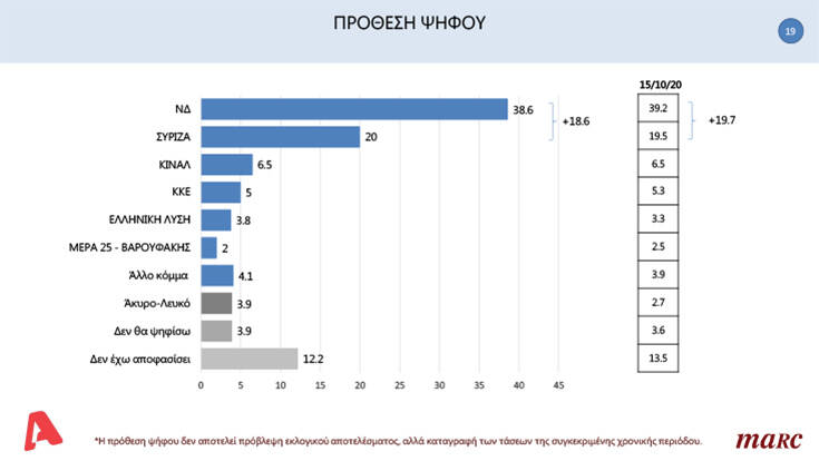Πιο συγκεκριμένα η Νέα Δημοκρατία συγκεντρώνει 38,6%, ο ΣΥΡΙΖΑ 20%, το ΚΙΝΑΛ 6,5%, το ΚΚΕ 5%, η Ελληνική Λύση 3,8%, το ΜέΡΑ 25 2%, Άλλο κόμμα 4,1%, Άκυρο-Λευκό 3,9%, Δεν θα ψηφίσω 3,9%, Δεν έχω αποφασίσει 12,2%.