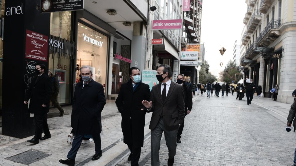 Στην οδό Ερμού βρέθηκαν, προκειμένου να κάνουν αυτοψία για τη λειτουργία των καταστημάτων με τους νέους κανόνες, ο υπουργός Ανάπτυξης Άδωνις Γεωργιάδης με τον αναπληρωτή υπουργό Νίκο Παπαθανάση.