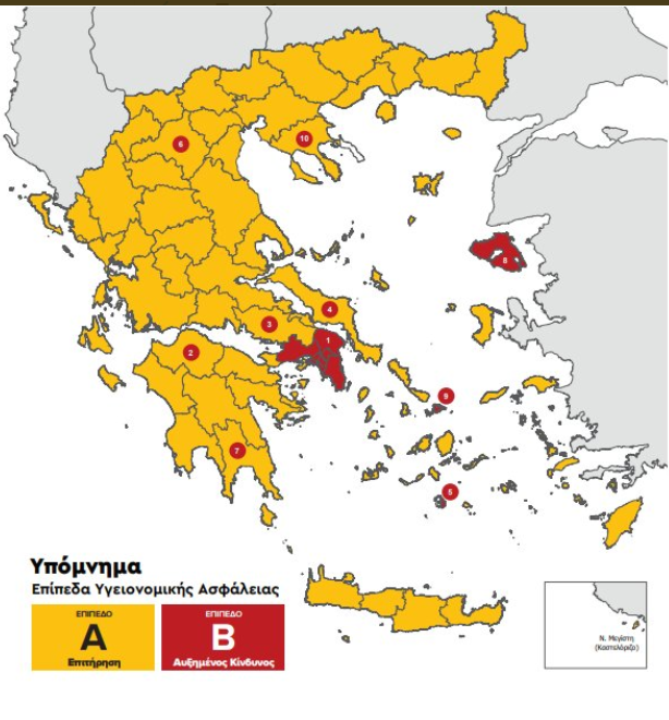 Συγκεκριμένα από το Σάββατο τίθεται σε ισχύ ο νέος Χάρτης Υγειονομικής Ασφάλειας και Προστασίας από τη λοίμωξη Covid-19 με δύο επίπεδα, Α – Επιτήρησης και Β – Αυξημένου Κινδύνου και τα μέτρα που εφαρμόζονται οριζόντια σε όλη την Επικράτεια είναι τα εξής: