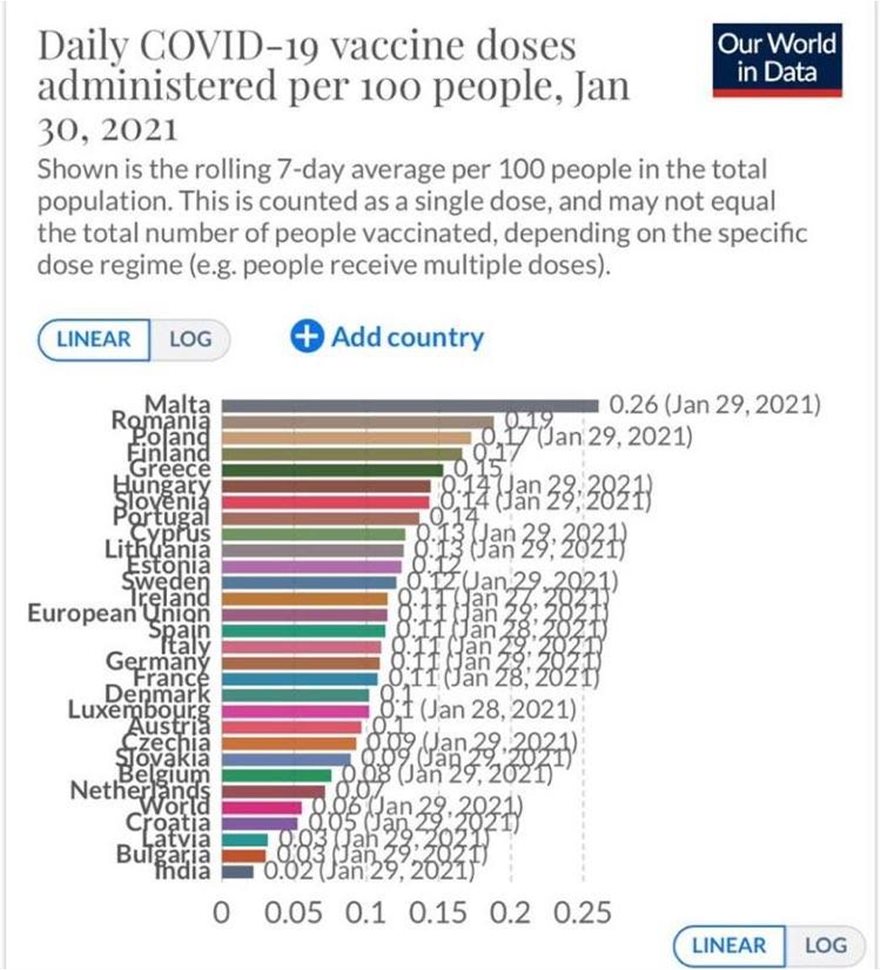 Στην πραγματικότητα ο κύριος Σκέρτσος με εκτενή δημόσια ανάρτηση του ανέφερε επί λέξει «Ο ρυθμός εμβολιασμών υπερβαίνει πλέον κατά μέσο όρο (7ήμερος κυλιόμενος δείκτης) τις 15.500 ημερησίως και μας κατατάσσει στην 5η θέση μεταξύ των 27 της ΕΕ ως προς το ποσοστό του πληθυσμού που εμβολιάζεται καθημερινά».