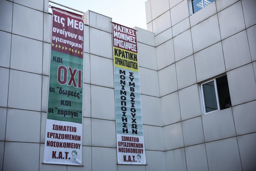 Μ’ αυτό το πανό κρεμασμένο στο κτίριο, υποδέχθηκαν οι υγειονομικοί του νοσοκομείου ΚΑΤ τον Κυριάκο Μητσοτάκη, που επιχείρησε να κάνει άλλο ένα επικοινωνιακό σόου για να πείσει ότι η κυβέρνησή του διατηρεί τον έλεγχο της πανδημίας στη χώρα μας.