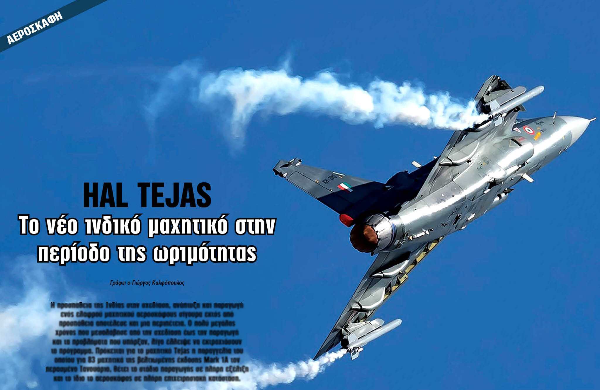 Η προσπάθεια της Ινδίας στην σχεδίαση, ανάπτυξη και παραγωγή ενός ελαφρού μαχητικού αεροσκάφους σίγουρα εκτός από προσπάθεια αποτέλεσε και μια περιπέτεια. Ο πολύ μεγάλος χρόνος που μεσολάβησε από την σχεδίαση έως την παραγωγή και τα προβλήματα που υπήρξαν, λίγο έλλειψε να εκτροχιάσουν το πρόγραμμα. Πρόκειται για το μαχητικό Tejas η παραγγελία του οποίου για 83 μαχητικά της βελτιωμένης έκδοσης Mark 1Α τον περασμένο Ιανουάριο, θέτει το στάδιο παραγωγής σε πλήρη εξέλιξη και το ίδιο το αεροσκάφος σε πλήρη επιχειρησιακή κατάσταση.