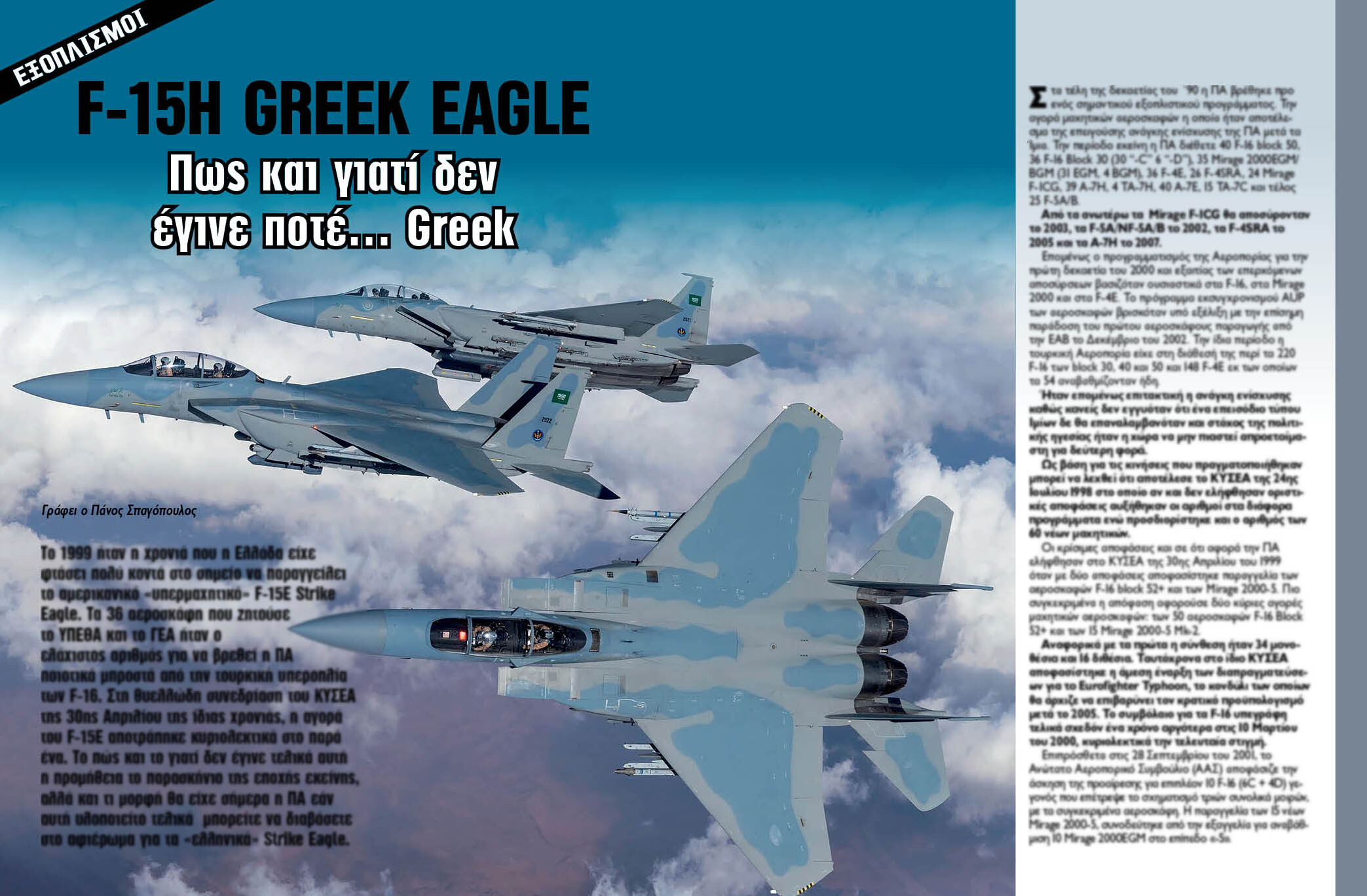 Το 1999 ήταν η χρονιά που η Ελλάδα είχε φτάσει πολύ κοντά στο σημείο να παραγγείλει το αμερικανικό «υπερμαχητικό» F-15E Strike Eagle. Τα 36 αεροσκάφη που ζητούσε το ΥΠΕΘΑ και το ΓΕΑ ήταν ο ελάχιστος αριθμός για να βρεθεί η ΠΑ ποιοτικά μπροστά από την τουρκική υπεροπλία των F-16. Στη θυελλώδη συνεδρίαση του ΚΥΣΕΑ της 30ης Απριλίου της ίδιας χρονιάς, η αγορά του F-15E αποτράπηκε κυριολεκτικά στο παρά ένα. Το πώς και το γιατί δεν έγινε τελικά αυτή η προμήθεια το παρασκήνιο της εποχής εκείνης, αλλά και τι μορφή θα είχε σήμερα η ΠΑ εάν αυτή υλοποιείτο τελικά μπορείτε να διαβάσετε στο αφιέρωμα για τα «ελληνικά» Strike Eagle.