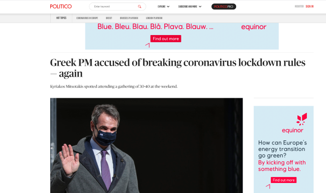 Με τίτλο «Ο Έλληνας πρωθυπουργός κατηγορείται ξανά για παραβίαση των κανόνων του lockdown», το Politico φιλοξενεί εκτενές ρεπορτάζ με το φαγοπότι του Κυριάκου Μητσοτάκη και άλλων, περίπου, 50 ατόμων της συνοδείας του στο σπίτι του βουλευτή της ΝΔ και καθηγητή καρδιολογίας Χριστόδουλου Στεφανάδη στην Ικαρία.