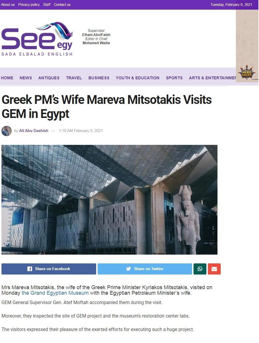 Δημοσιεύματα από την Αίγυπτο υποστηρίζουν πως η σύζυγος του πρωθυπουργού, Μαρέβα Μητσοτάκη, βρέθηκε στην Αίγυπτο και επισκέφθηκε (ξανά) το (υπό κατασκευή) Μεγάλο Αιγυπτιακό Μουσείο στην Γκίζα μαζί με τη σύζυγο του Αιγύπτιου υπουργού Πετρελαίων ενώ συνοδεύονταν από τον επικεφαλής του μουσείου στρατηγό Ατέφ Μοφτάχ.
