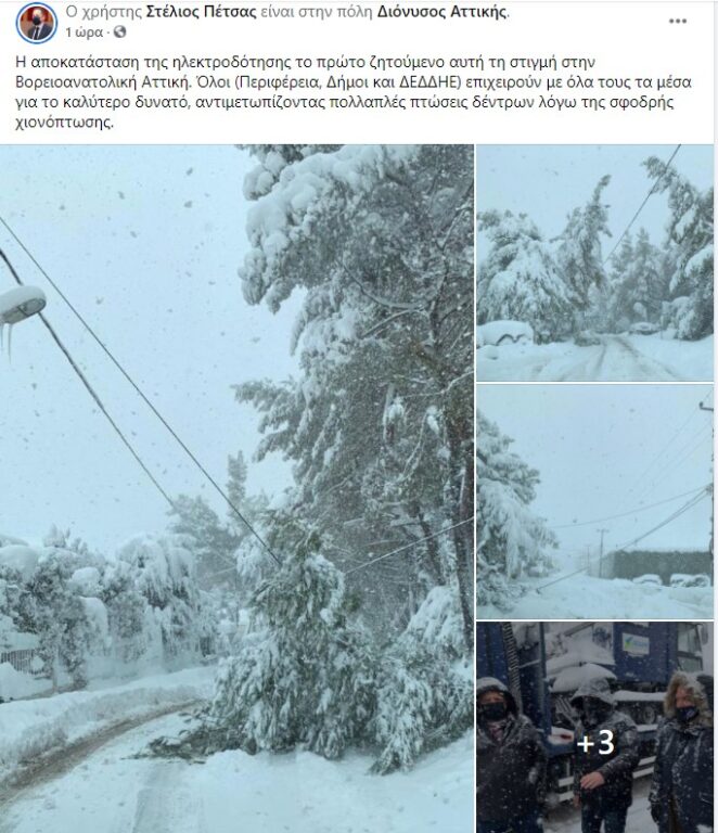 «Η αποκατάσταση της ηλεκτροδότησης το πρώτο ζητούμενο αυτή τη στιγμή στην Βορειοανατολική Αττική. Όλοι (Περιφέρεια, Δήμοι και ΔΕΔΔΗΕ) επιχειρούν με όλα τους τα μέσα για το καλύτερο δυνατό, αντιμετωπίζοντας πολλαπλές πτώσεις δέντρων λόγω της σφοδρής χιονόπτωσης».