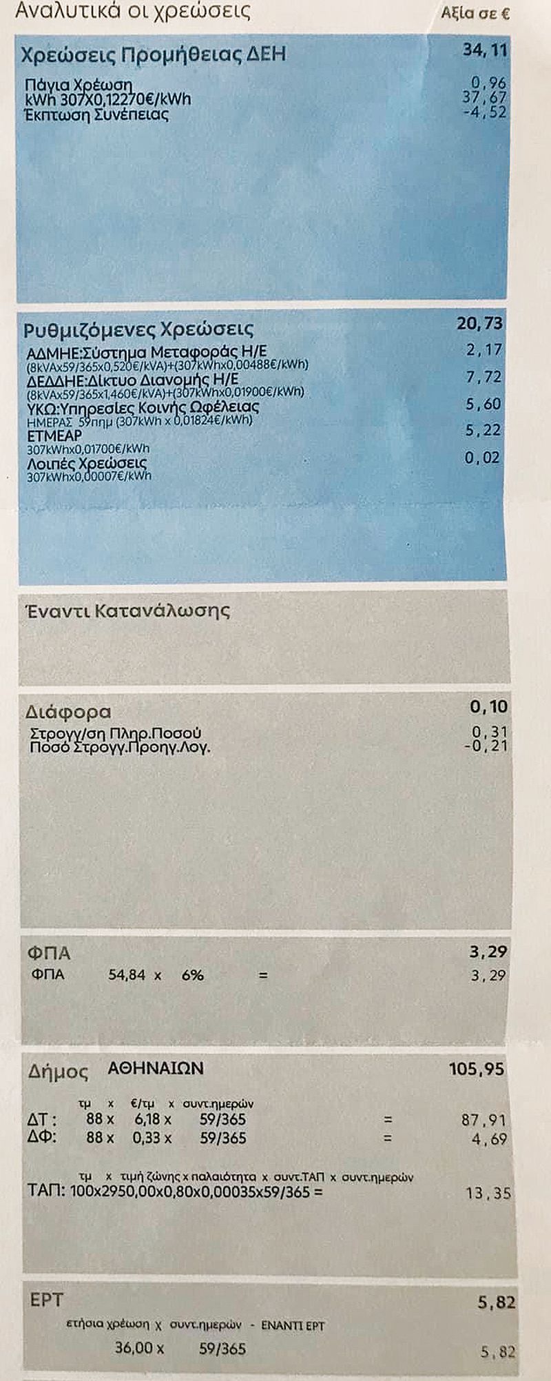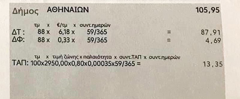 Στον εν λόγω λογαριασμό και στην αιτιολογία «Διάφορα» ο αναγνώστης είδε να αναγράφεται το ποσό των 111,87 ευρώ, δηλαδή το 65,80% του λογαριασμού. Στην ανάλυση, λοιπόν, εμφανίζεται ότι 5,82 ευρώ πηγαίνουν στην ΕΡΤ και… 105,95 στον Δήμο Αθηναίων! Δηλαδή, το 62,32% του λογαριασμού ενός πολίτη αποτελούν τα δημοτικά τέλη. Αυτή είναι μία από τις πολλές καταγγελίες πολιτών, οι οποίοι κάνουν λόγο για «ληστρικά τέλη», που γονατίζουν τα νοικοκυριά. Σκεφτείτε τα ποσά που μπαίνουν στα ταμεία από τους λογαριασμούς της ΔΕΗ.