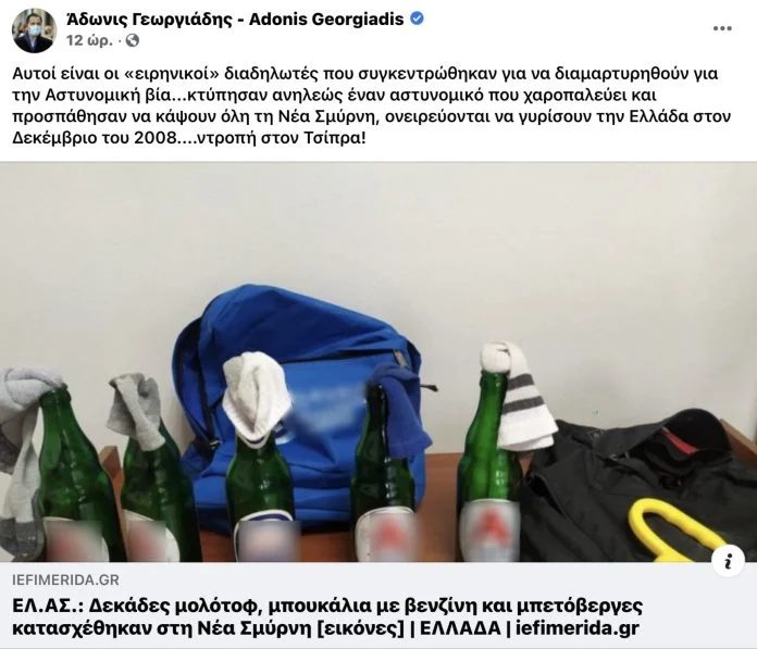 Εχθές το βράδυ λοιπόν ο υπουργός ανάρτησε το ακόλουθο κείμενο: «Αυτοί είναι οι «ειρηνικοί» διαδηλωτές που συγκεντρώθηκαν για να διαμαρτυρηθούν για την Αστυνομική βία…κτύπησαν ανηλεώς έναν αστυνομικό που χαροπαλεύει και προσπάθησαν να κάψουν όλη τη Νέα Σμύρνη, ονειρεύονται να γυρίσουν την Ελλάδα στον Δεκέμβριο του 2008….ντροπή στον Τσίπρα!»