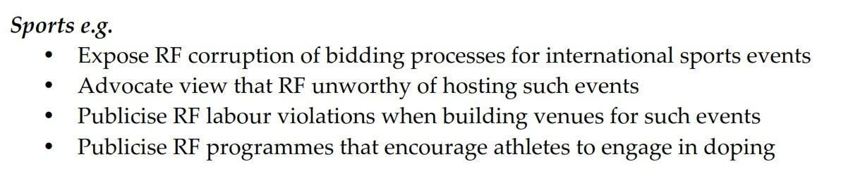 • Υποστήριξη ότι η Ρωσία είναι ανάξια να φιλοξενήσει τέτοια γεγονότα