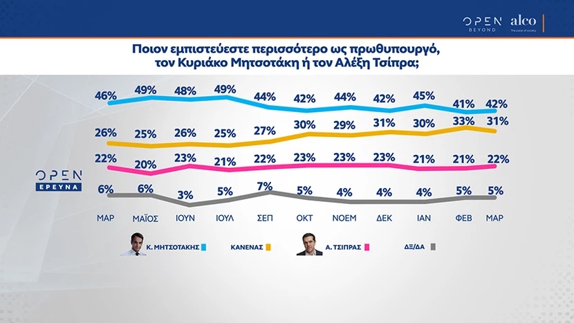 Το 42% των συμμετεχόντων εμπιστεύεται περισσότερο για πρωθυπουργό τον Κυριάκο Μητσοτάκη ενώ το 22% τον Αλέξη Τσίπρα. Το 31% θεωρεί ότι κανένας δεν είναι άξιος εμπιστοσύνης.