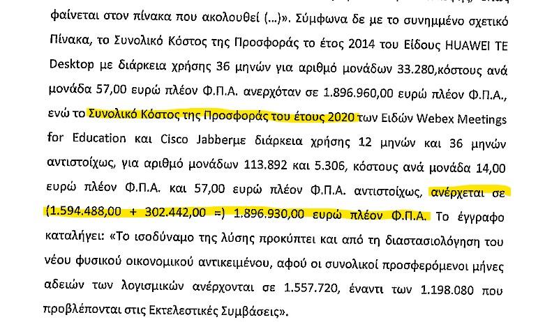 Πρώτον, η συνεργασία του ελληνικού Δημοσίου με τη Cisco ΔΕΝ είναι δωρεάν. Αντιθέτως, θα (μας) κοστίσει σε πρώτη φάση 1.896.630 ευρώ πλέον ΦΠΑ. Τόσο κοστολογούνται οι 113.892 άδειες χρήσης του λογισμικού Webex, καθώς και οι 5.306 άδειες χρήσης λογισμικού Cisco Jabber, την προμήθεια των οποίων ενέκρινε στις 16/03/2021 το Ελεγκτικό Συνέδριο.