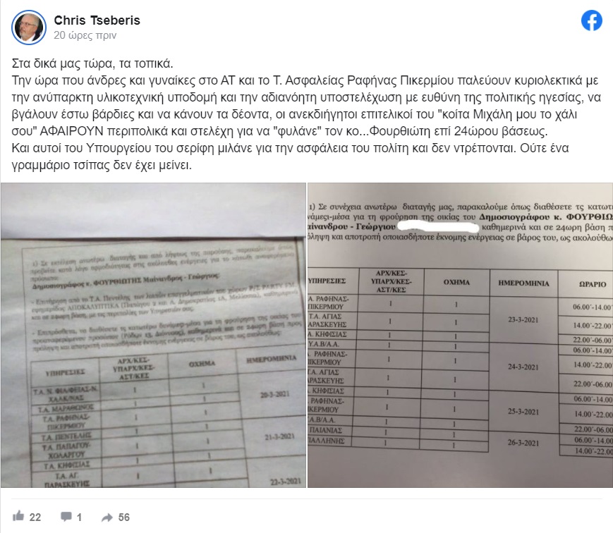«Την ώρα που άνδρες και γυναίκες στο ΑΤ και το Τ. Ασφαλείας Ραφήνας Πικερμίου παλεύουν κυριολεκτικά με την ανύπαρκτη υλικοτεχνική υποδομή και την αδιανόητη υποστελέχωση με ευθύνη της πολιτικής ηγεσίας, να βγάλουν έστω βάρδιες και να κάνουν τα δέοντα, οι ανεκδιήγητοι επιτελικοί του “κοίτα Μιχάλη μου το χάλι σου” αφαιρούν περιπολικά και στελέχη για να “φυλάνε” τον κο…Φουρθιώτη επί 24ώρου βάσεως. Και αυτοί του Υπουργείου του σερίφη μιλάνε για την ασφάλεια του πολίτη και δεν ντρέπονται. Ούτε ένα γραμμάριο τσίπας δεν έχει μείνει» έγραψε ο Χρήστος Τσεμπέρης.