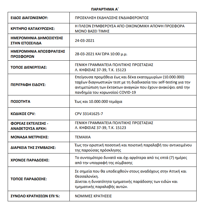 Συγκεκριμένα τα μεσάνυχτα της Τετάρτης (παραμονές Εθνικής επετείου) αναρτήθηκε έγγραφο που περιλαμβάνει σοβαρές ενδείξεις φωτογραφικού διαγωνισμού για περί του διαγωνισμού για την προμήθεια 10 εκατ. self test.