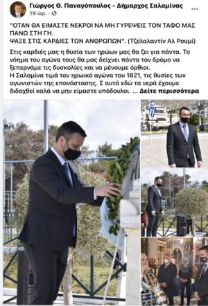 «Όταν θα είμαστε νεκροί να μη γυρέψεις τον τάφο μας πάνω στη γη. Ψάξε στις καρδιές των ανθρώπων». Με αυτή τη φράση του Τζελαλεντίν Ρουμί στην ανάρτησή του, ο κ. Παναγόπουλος θεώρησε πως πρέπει να τιμήσει τους ήρωες του 1821.