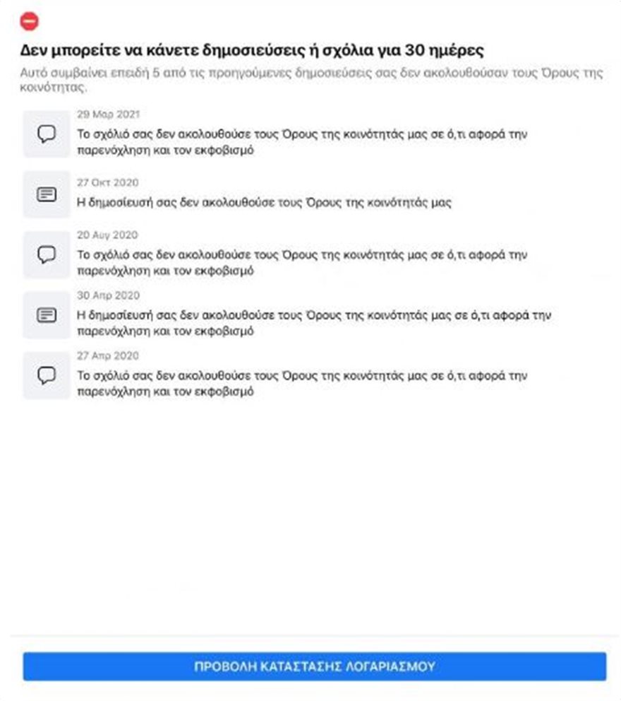Το Facebook αναφέρει ότι πρόκειται για σχόλια και δημοσιεύσεις που έγιναν από τον Απρίλιο του 2020 έως και σήμερα, 29 Μαρτίου 2021.